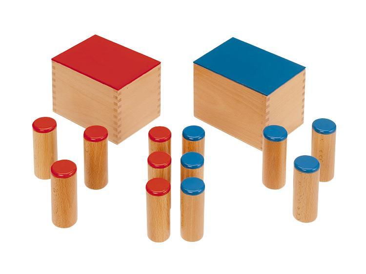 赤と青が対になっている筒の中に米ぬか、砂、小石などが入っており、振ると異なる音がします(6種類)。耳のそばで振って同じ音を見つけます。