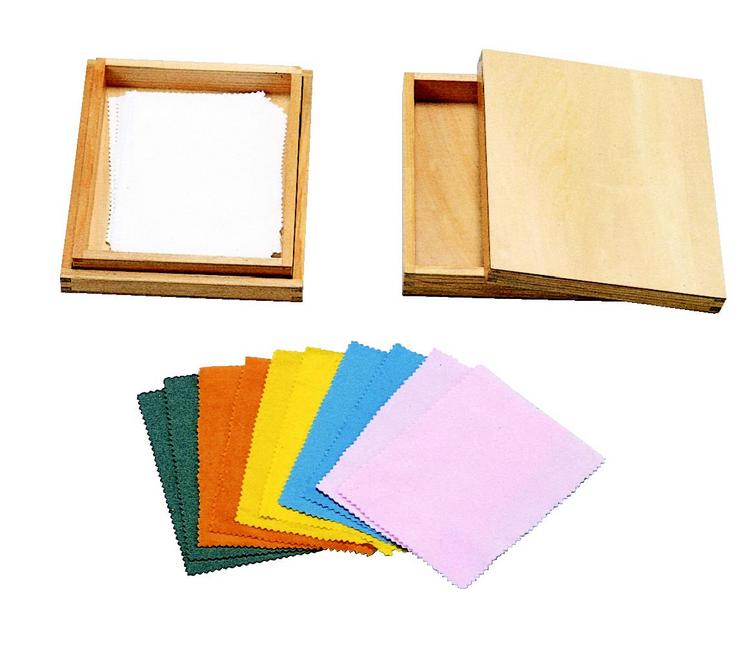 木綿・ウール・ネル・ナイロン・フェルトの5種類の布が、種類ごとに色の違うもの1対と白のものが1対入っています。目隠しして、手でふれることによって同じ材質の布を見つけます。