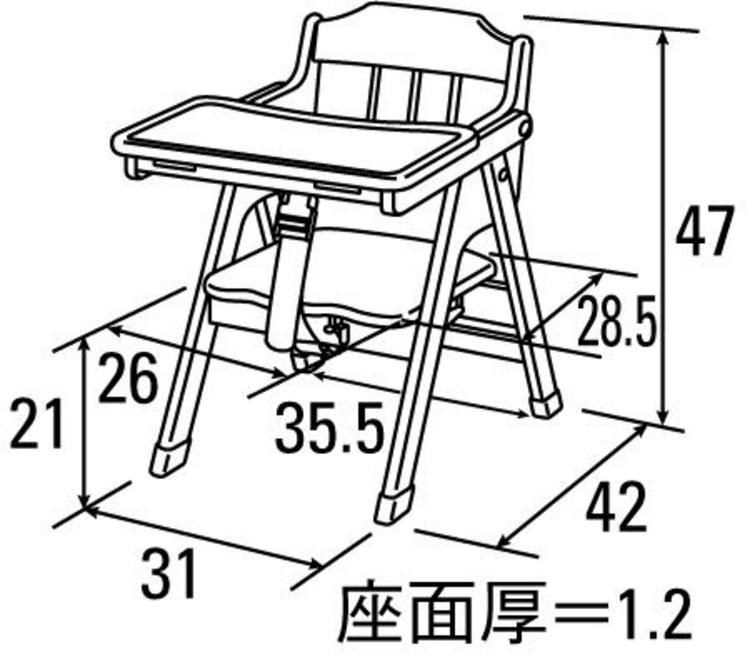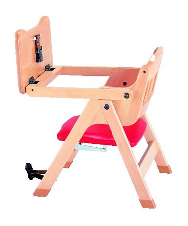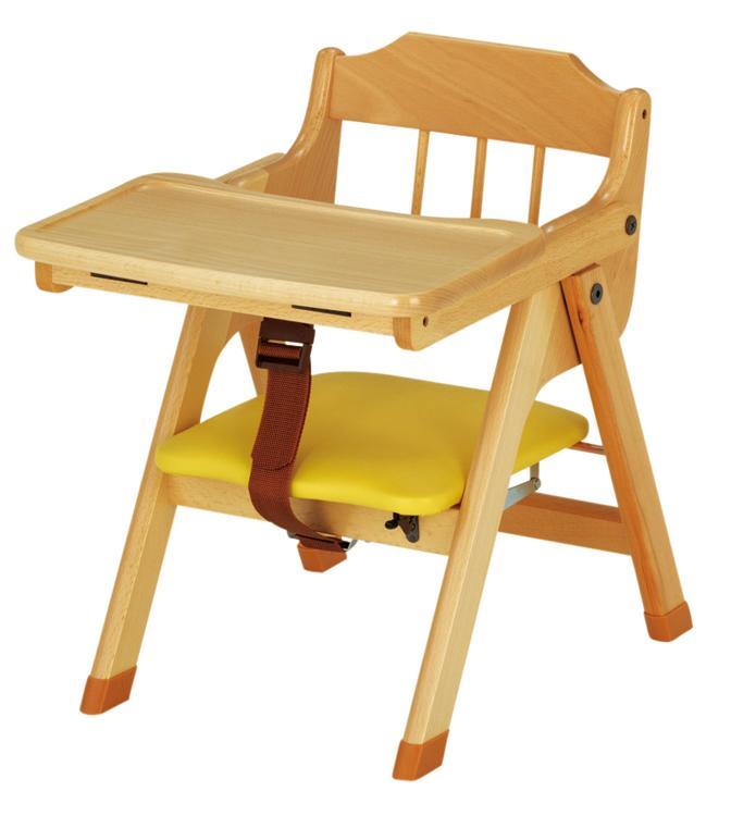 前方へテーブルを起こし、子どもの出入りを容易にした乳児用椅子です。テーブルはバックル式股ベルトで固定でき、テーブルのみ、背へ回すこともできます。