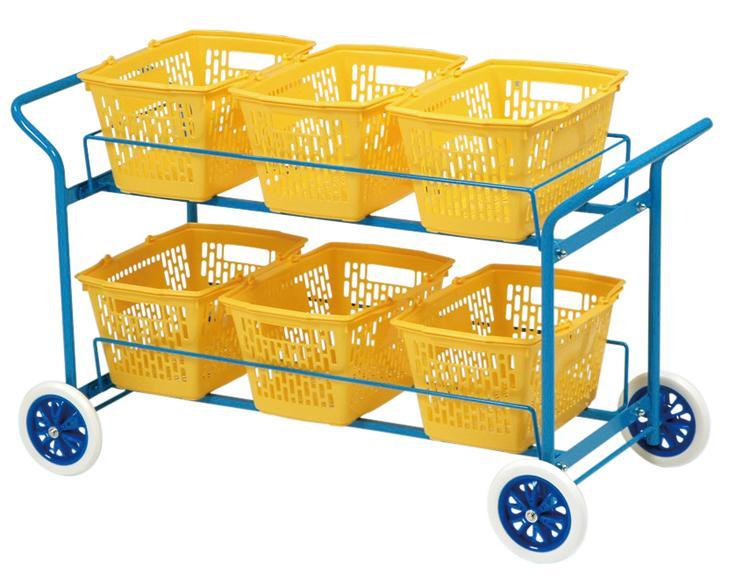スーパーの買い物かごを6個載せてあり、小物(ブロックや積み木、ままごと道具など)の整理や運搬に最適なワゴンです。