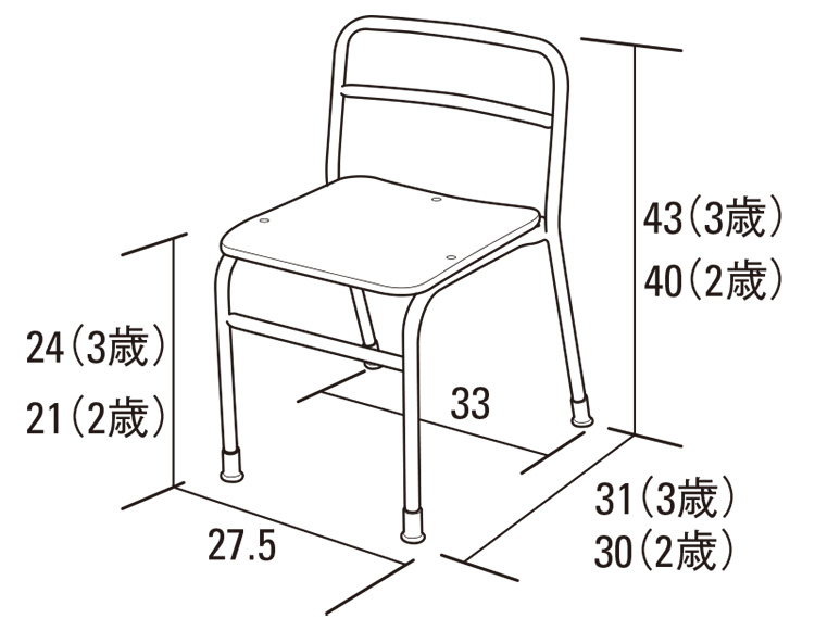 座板に指紋がつきづらいメラミン樹脂を使用した耐久性、耐摩耗性に優れた椅子です。座面の奥行き・高さを年齢別に合わせることで、背もたれにしっかり背がフィットし、床が脚につくので姿勢がしっかりと安定します。