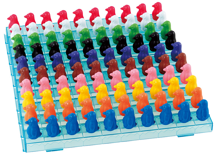●対象年齢:5歳〜●セット内容:アイスバー10個・ペンギン10色×10羽●材質:ABS樹脂・PVC●寸法:アイスバー=3×30×高さ1.5cm●重量:ペンギン=8g