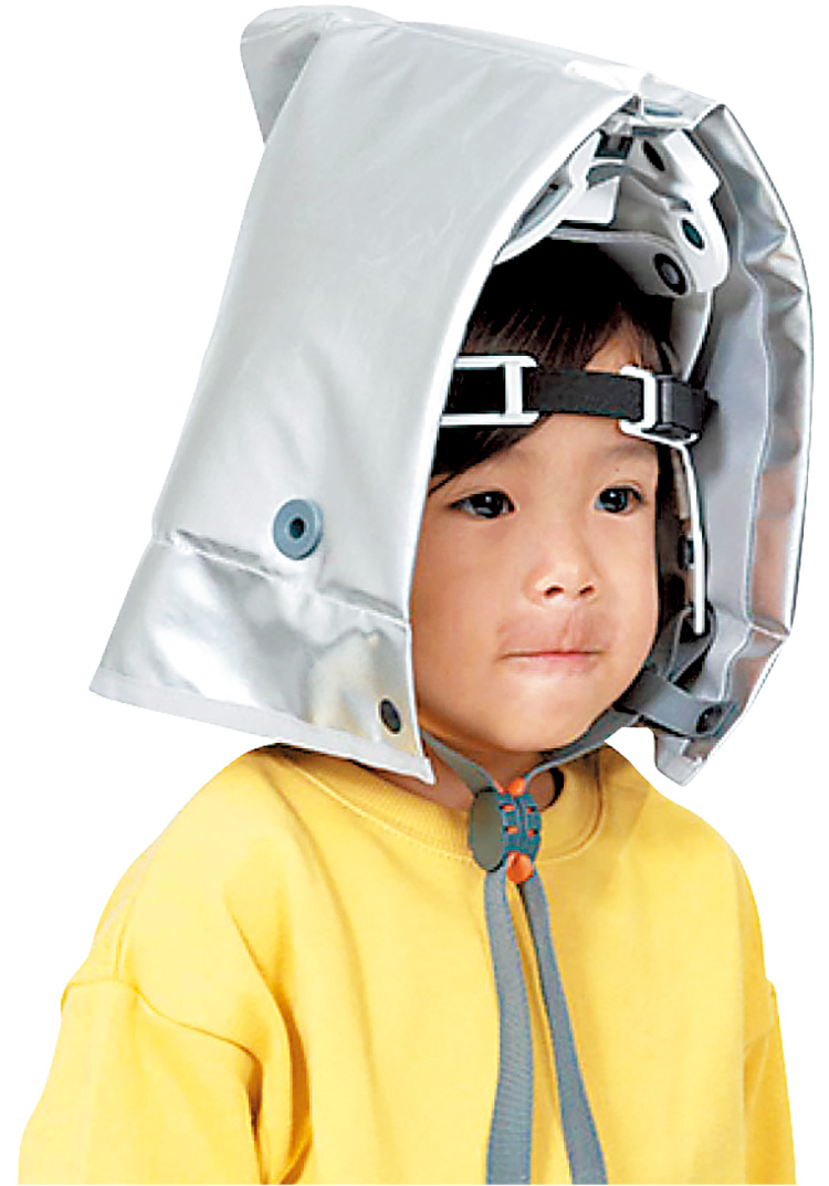 ⃝●サイズ:頭囲=45~65cm●材質:内装=ポリプロピレン・ポリカーボネート ずきん=難燃ポリエステル(表地)・防炎ツイル(裏地)●寸法:28.9×21×厚さ6.2cm(頭巾部をたたんだサイズ)●重量:372g厚生労働省保護帽規格「飛来・落下物用」国家検定合格品 PAT/PAT.P