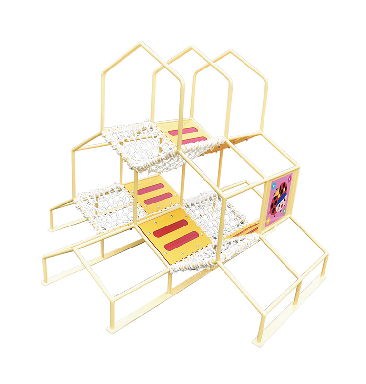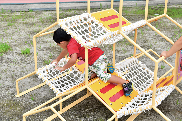 「バランス」感覚を養い、「多方向への動き」で、幼児年頃に必要な運動を促します。6角形の形状が、上下左右だけでなく斜めの動きも促し、枠のサイズも一様でないため、いろんな遊び方を見つけながら楽しめ、難易度の高い遊びへ発展していきます。表面の塗装は従来品よりも製品表面が熱くなりにくいパステルコートを使用しています。