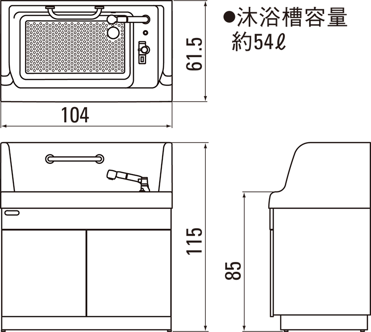 ●材質:キャビネット本体・扉=ポリエステル化粧合板 カウンタートップ=FRP●重量:44㎏●沐浴槽容量:約54L※設置には給湯・給水・排水工事が必要です。