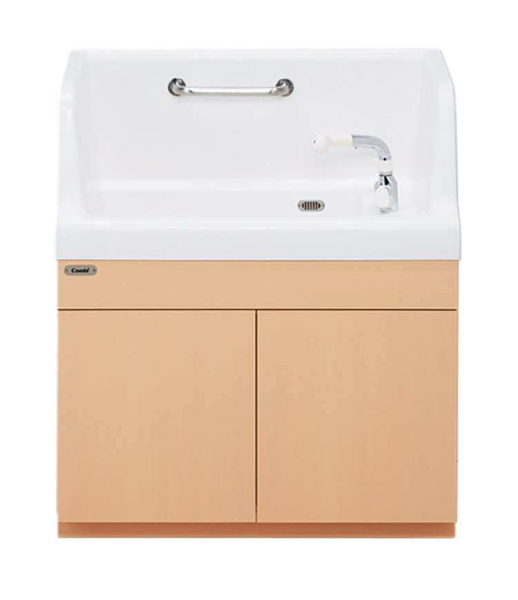 限られた空間でも設置可能なコンパクトなのに広々使えるシンクバス。仰向けはもちろん、座っても、立たせても、2歳(24か月)頃まで長く使えるコンパクト沐浴ユニット。