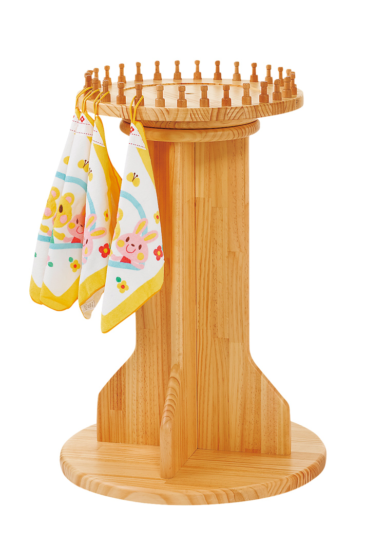 回転式の円形木製フックスタンドです。天板が回転するので壁面近くなど、場所をとらずに設置ができ、部屋の空間を有効に利用できます。フック30個