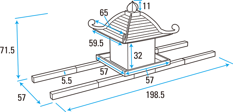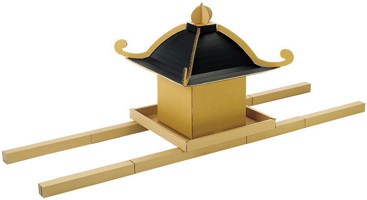 • 神輿本体(屋根・本体・台座)に「屋根飾り」、「蕨手(4本セット)」、「担ぎ棒(2本セット)」を追加した例。
