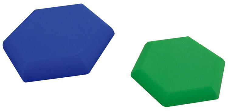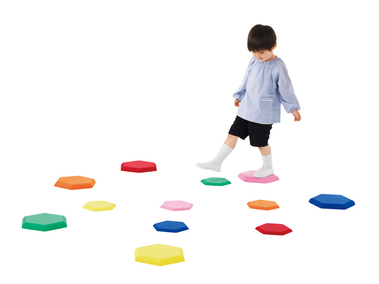 六角形(ヘキサゴン)の形状の飛び石で、室内をアスレチックコースにする運動用品です。大小2種類の大きさで、高さも3cm と1.5cm と異なります。ひっくり返らないように、端の部分は斜めに削られています。ソフトで安全性の高いEVAスポンジ製