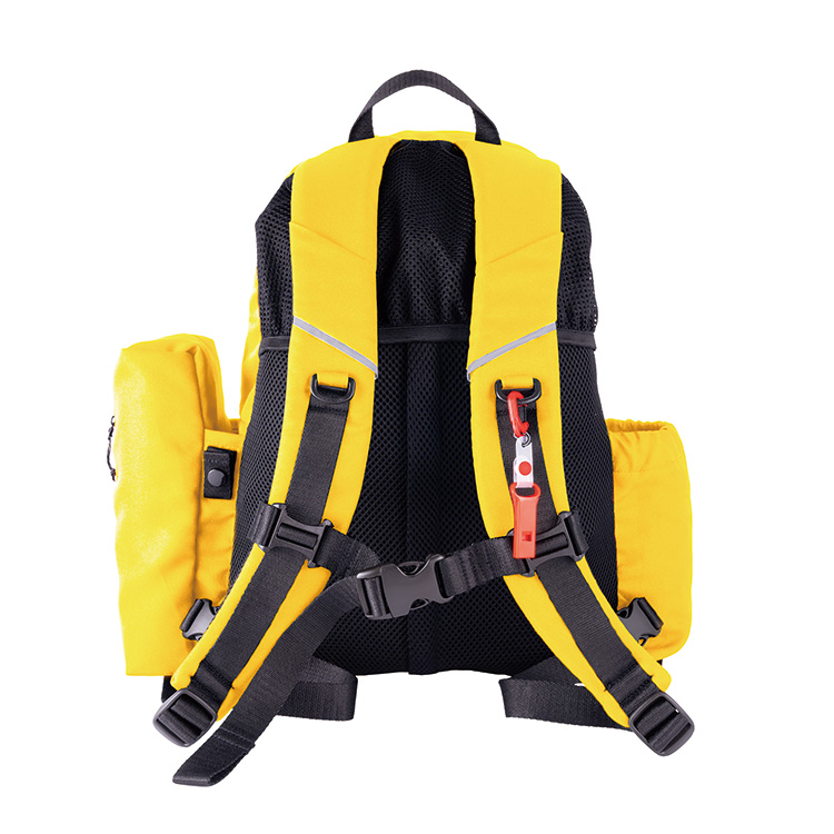 1人の保育士で2人の園児を避難させることができます。多機能なお散歩リュックとして使用することができ、緊急時には避難用抱っこひもとして使用できます。付属保冷バッグは遠足時にお弁当を入れたり、暑さ対策用の保冷剤を持ち運ぶことができます。