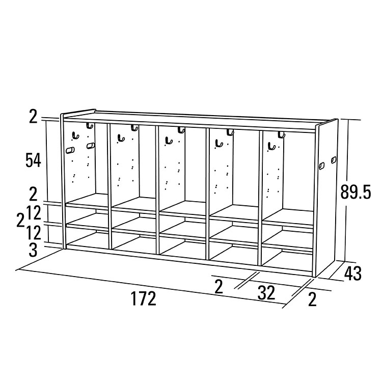 ●材質: 芯材=パーティクルボード・MDF 表面材=プリント化粧MDF・ポリ板MDF 小口=ソフトエッジ フック=亜鉛ダイカスト(ユニクロメッキ)●重量:3連=35kg 5連=58kg