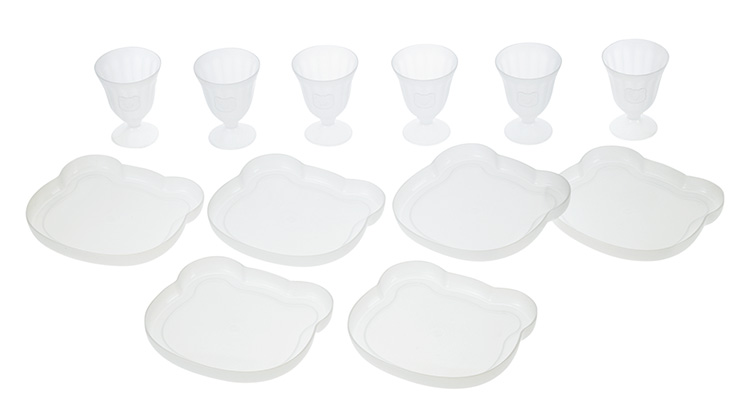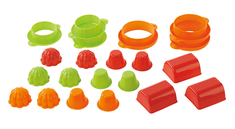 大きなケーキ型などの本格的な道具やパフェグラスなどの容器を使って、砂場でケーキ屋さんごっこが楽しめるセットです。パフェスプーン、ナイフ、フォーク、トッピングは柔らかい材質でできています。