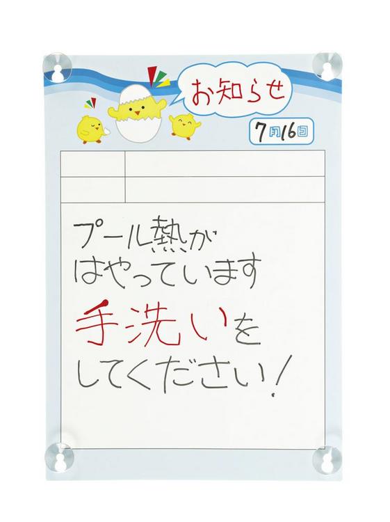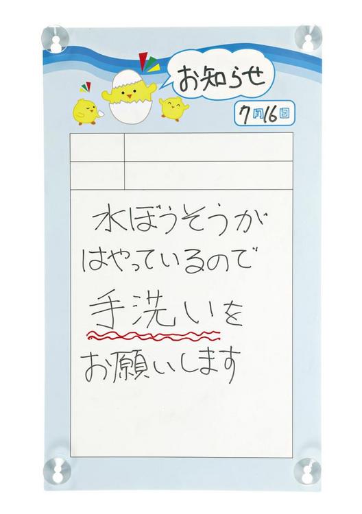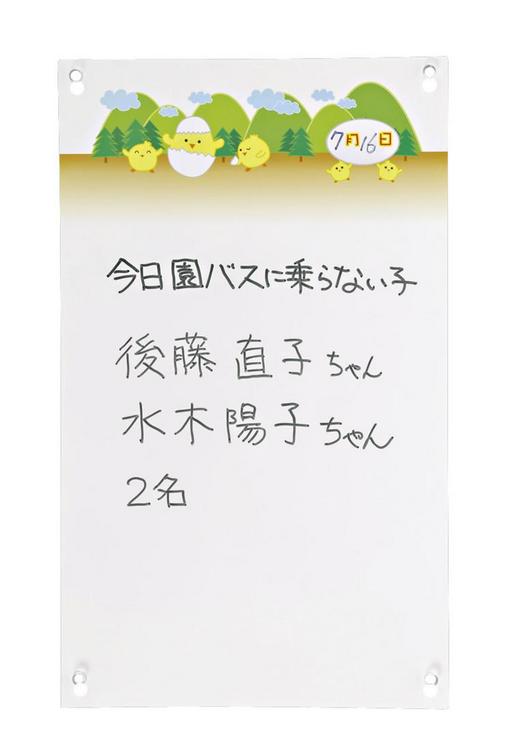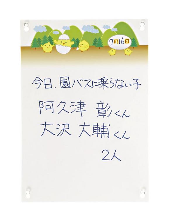 園バス車内の窓に吸盤で貼って使用します。ホワイトボード用のペンが使用でき、車内側は連絡事項、車外側は感染情報など保護者へのお知らせを記入します。