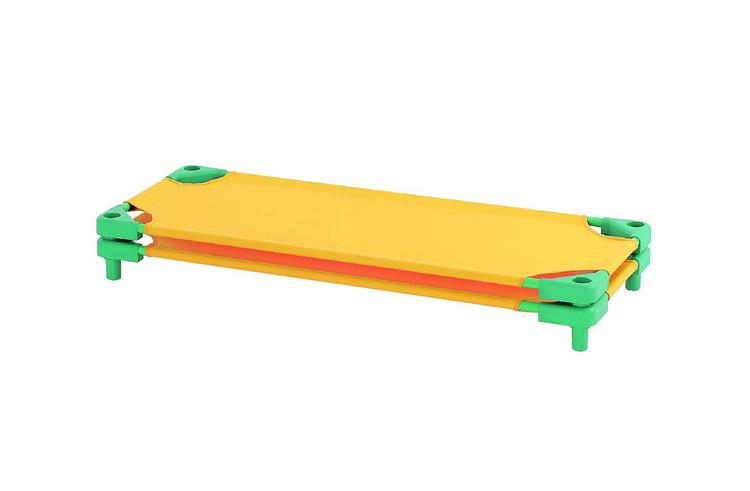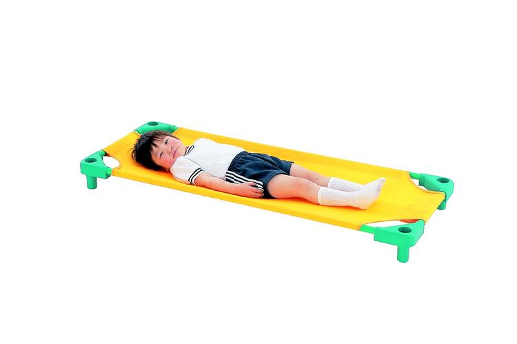 おひるね時に、さっと取り出して使用し、即座に収納することができる簡易ベッドです。収納もスタッキングができて場所をとりません。メッシュシートは取り外すことができます。組立式