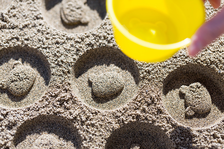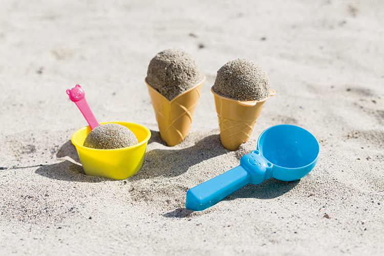 アイスクリーム屋さんごっこができる砂場セットです。ディッシャーで砂をすくい、コーンやカップに盛りつけて遊びます。スプーンはトッピングなどに使用でき、カップは砂型としても使えます。室内のおままごとにも使用できます。ネット入