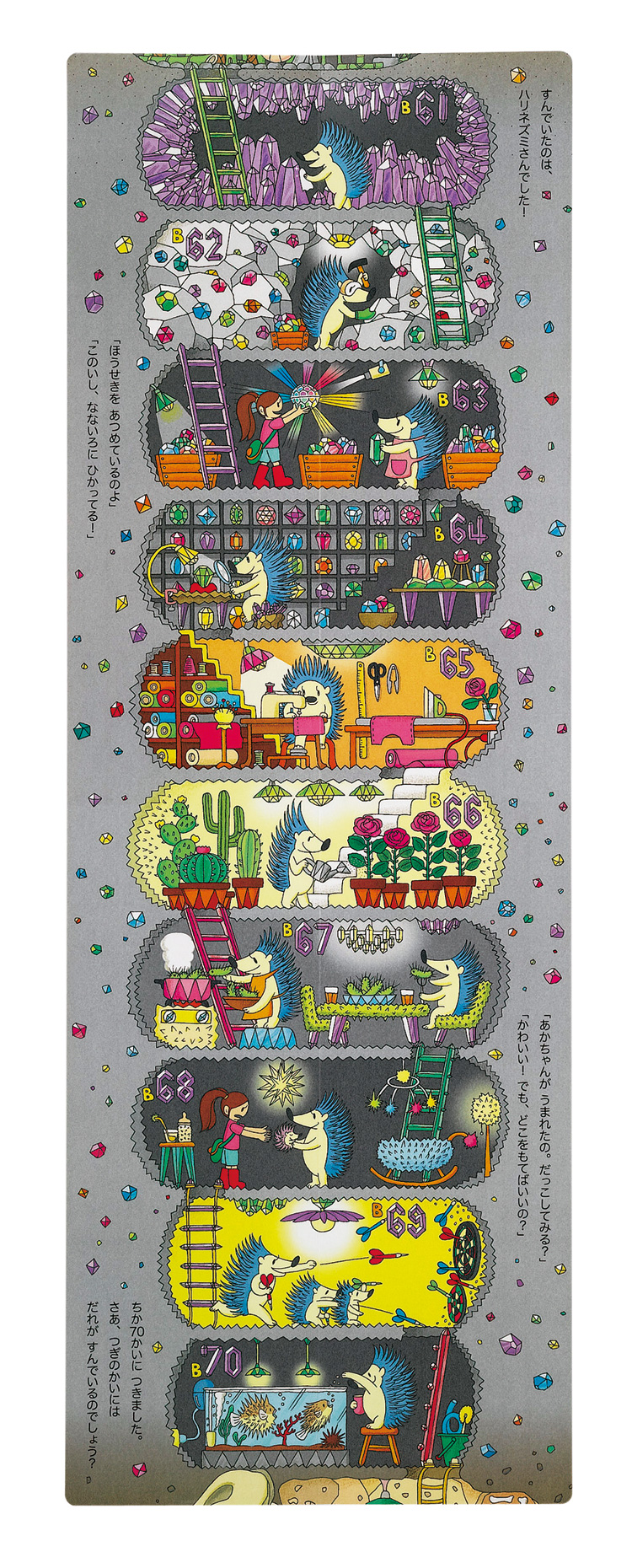 地面の中にある不思議な家。物語の展開に合わせて下へ下へとおりていく感じが楽しめ、話の流れを順を追って理解することができます。