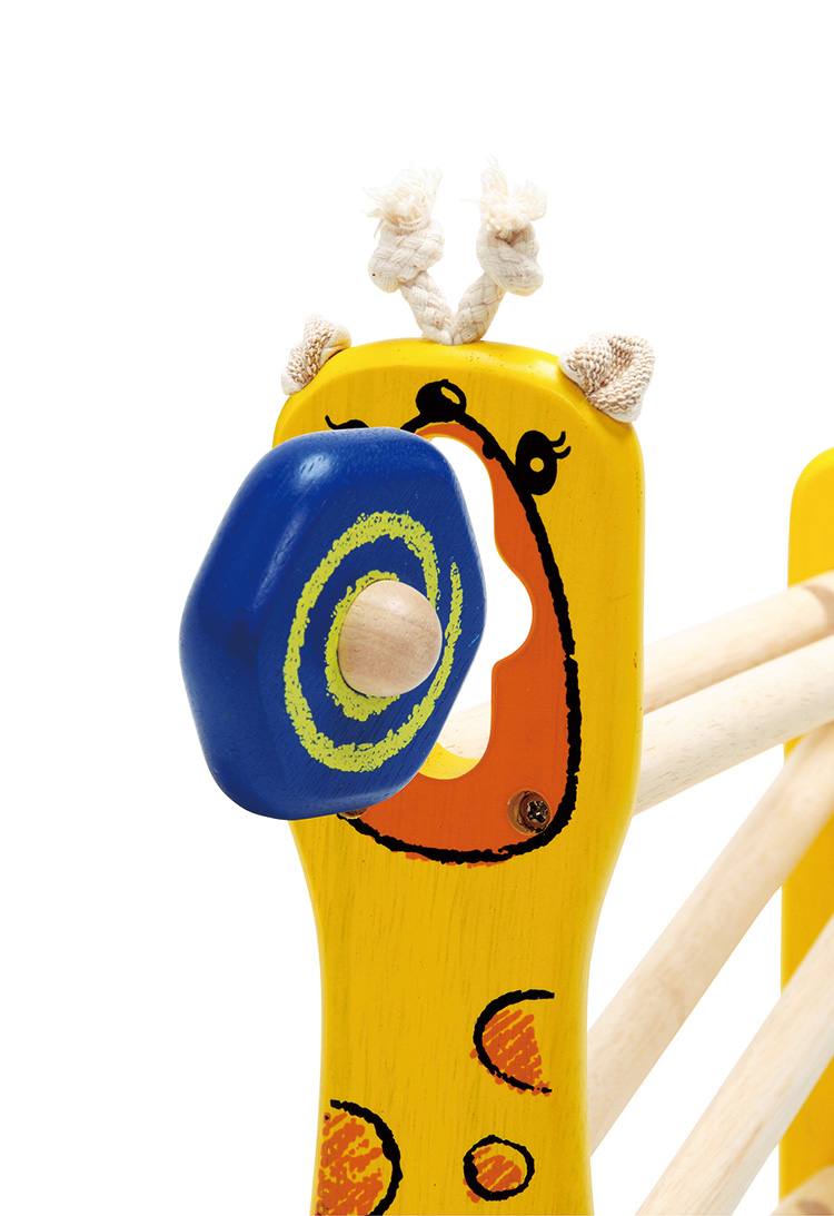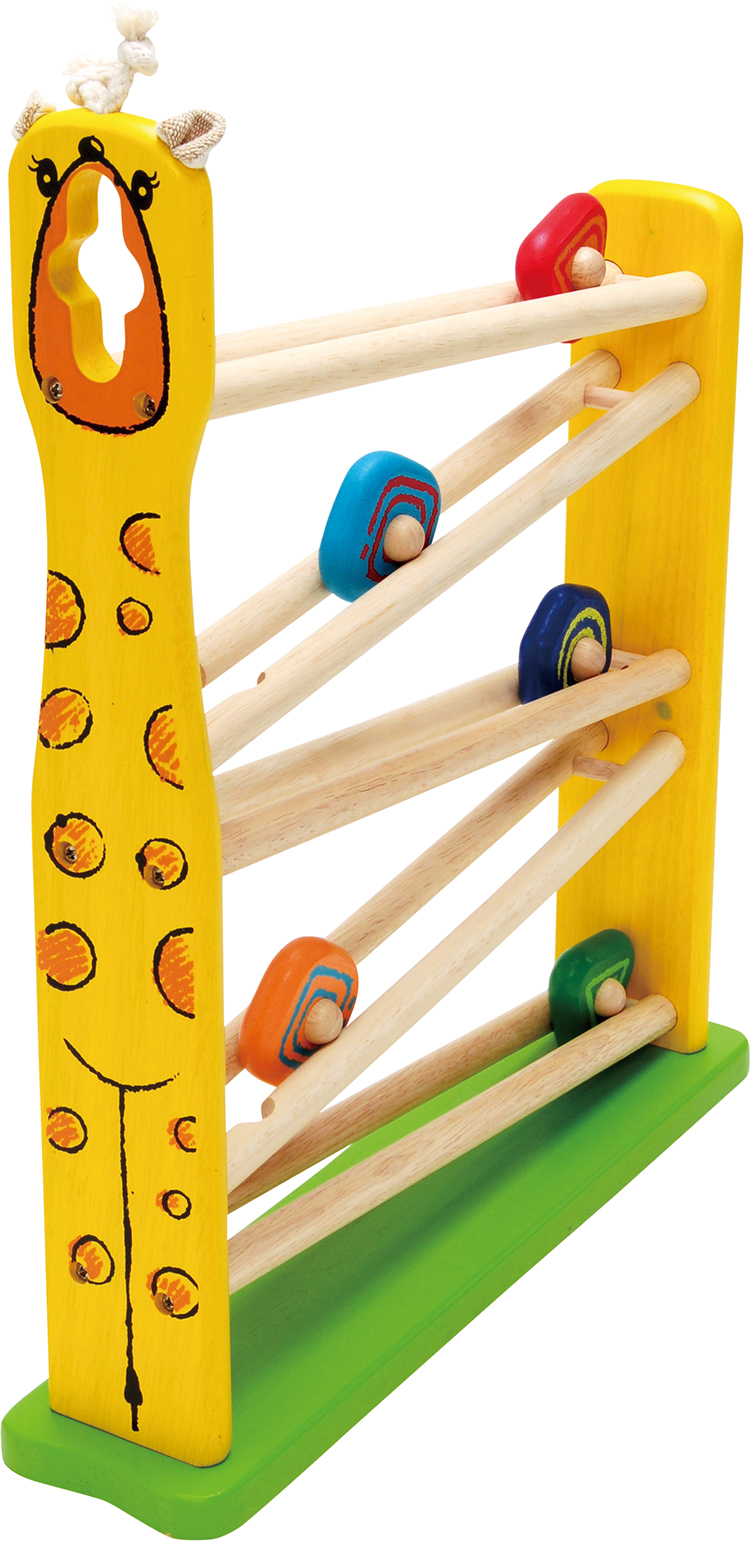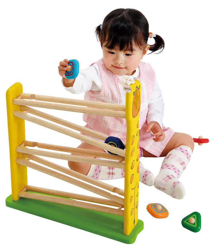 かわいいキリンをモチーフにしたスロープトイ。キリンの口にパーツを入れると、5段階に続くスロープをコロコロと転げ落ちます。回転しながら落ちていくコロコロパーツの模様も楽しく、何度でも転がしたくなる定番おもちゃです。