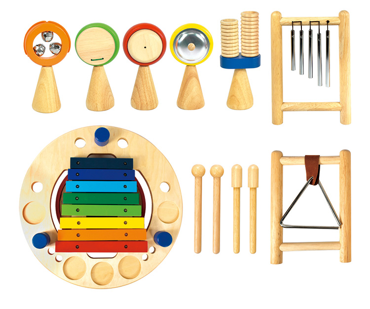 ●セット内容: 本体(木琴・太鼓)×1 マラカス・ハンドベル・ハンドシンバル・カスタネット・トライアングル・ダブルギロ・チャイム×各1 バチ×2組