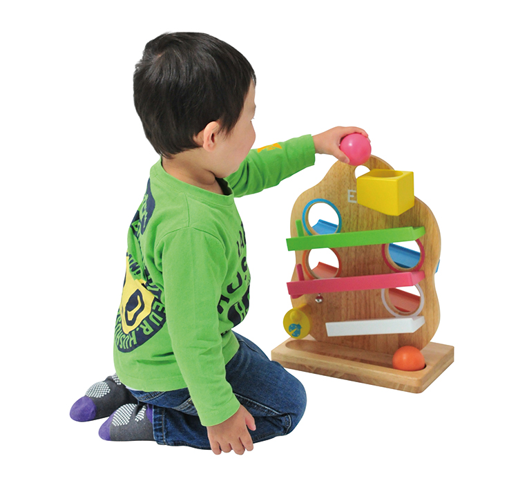 黄色のえんとつから4色のボールがカラフルなスロープを転がっていきます。スロープの最後には鈴がかわいい音を奏でます。