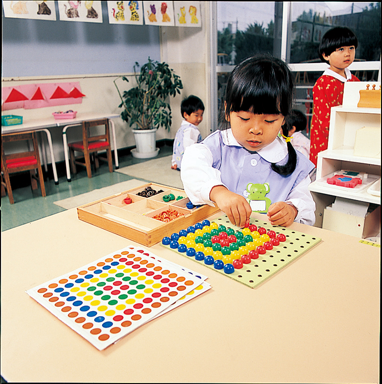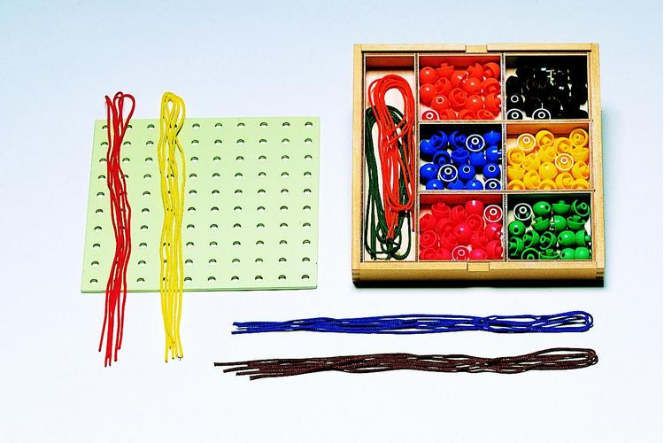 色玉に色ひもを通しての色分け遊びなど、豊富な遊びができます。造形感覚や、手指の巧緻性が養える優れた教材です。