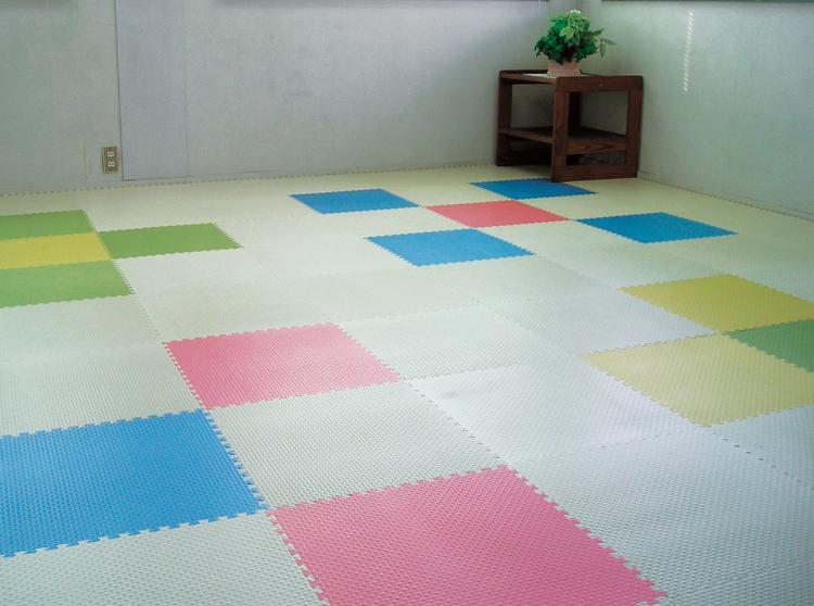 表面にエンボス加工がほどこしてあり、滑り止め効果があります。汚れやこぼした液体なども染み込まず、サッとふき取れ衛生的です。クッション性があり、転んでも安心です。専用スロープは段差を解消できます。防炎加工・抗菌加工。