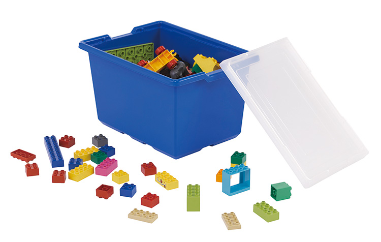 収納ケースが6個で1セットです。透明なふたが付き、ケース自体は積み重ねが可能です。また、ブロックをケースの中に入れて洗えるように、水抜きの穴が開いています。