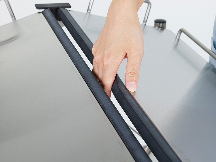 ・ 折りたたみワゴンを開くときに手が挟むことがあっても安全なように、上段の棚板にシリコンゴムが付いています。