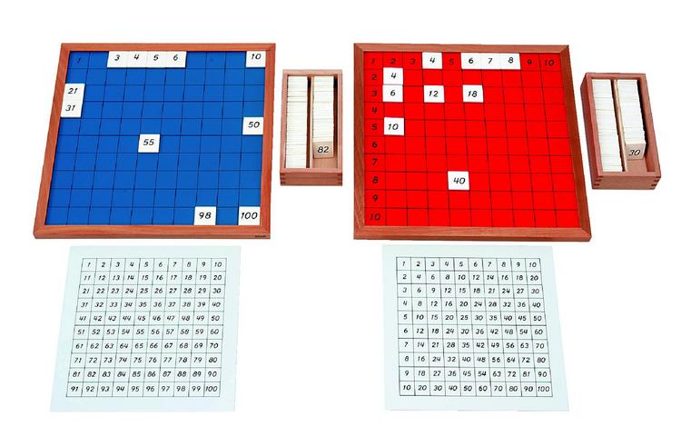 100までの数字の配列の暗記の強化練習のための教具です。1~100までの数字のタイルを、マス目に並べることによって、1~100までの数の配列を理解させます。