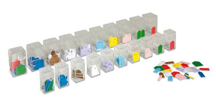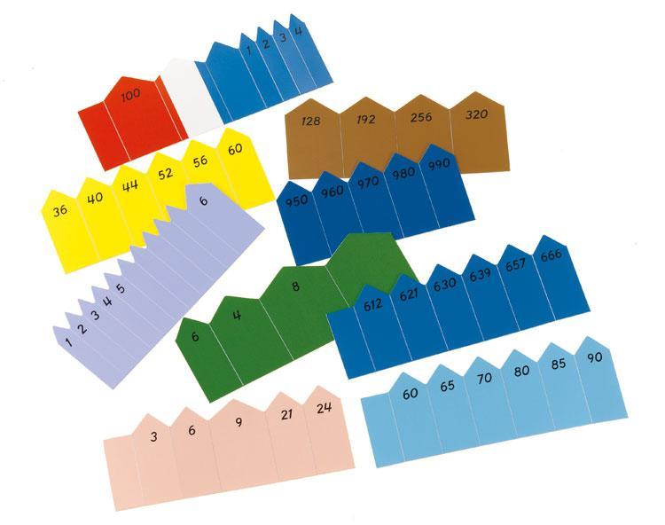 色棒ビーズと金ビーズのセットです。大きな数のたし算やかけ算に使います。ビーズで正方形を作って、二乗を理解し、立体を作って三乗を理解します。『二乗三乗の矢印カード』には数字が書いてあるものとないものがあります。無地のものは数字を書き入れて使います。