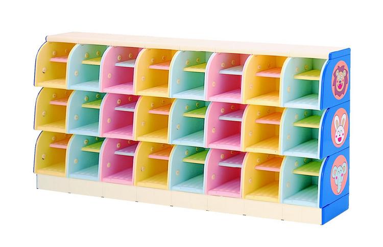 イエロー、ピンク、ブルーと、3色の組み合わせのカラフルな明るいシューズラックで、水で汚れを洗い流せます。各収納部は特殊ネジにより連結されており、増設が1列単位でできます。