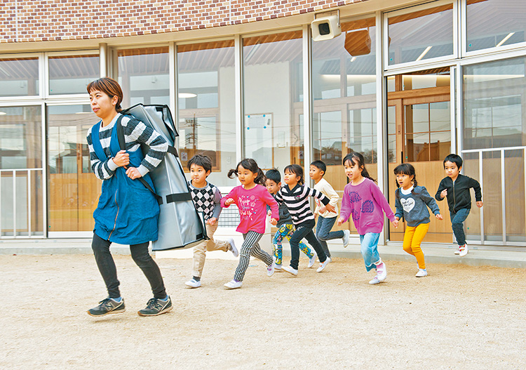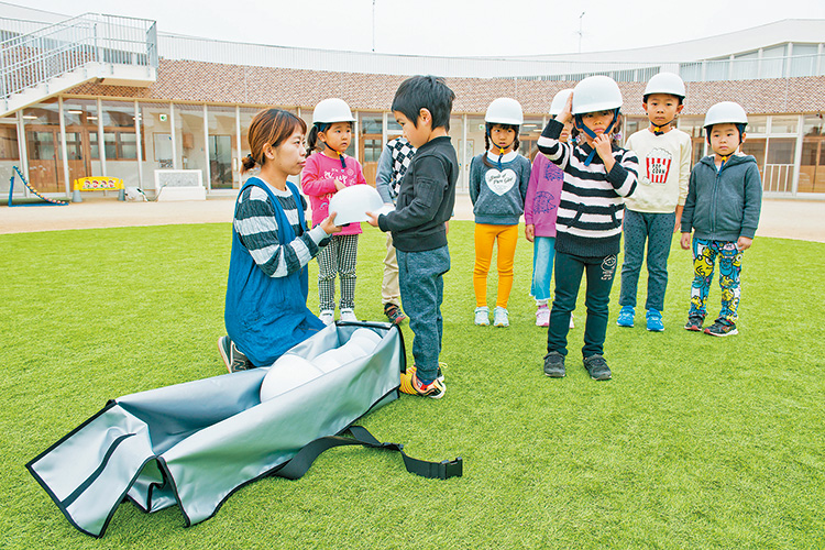 ヘルメットを備えるときの悩みの一つが置き場所。揺れている最中にヘルメットをかぶることはできないので、必ずしも園児の近くになくていいのです。揺れが収まったらまとめておいたヘルメットを素早く持ってきて園児にかぶせましょう。