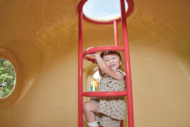 半円形ドームでできたFRP遊具です。直接つなげたり、運動遊具の付いた橋で接続したりして、遊びを広げられます。また、ドームの中に机やベンチを置くことができ、天井の窓から周囲をのぞけるようなリング登りもオプションで付けられます。隠れ家のようなドームで心を落ち着かせたり、遊具として体の発達につなげたりと、いろいろな使い方が可能です。ドームのカラーバリエーションは4種類あります。