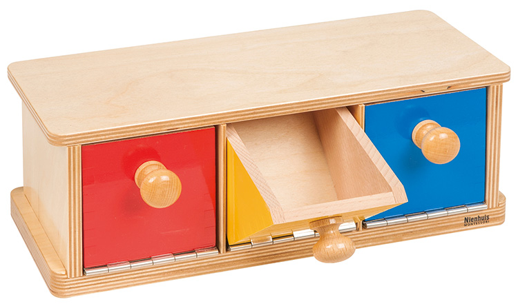 つまみを3本の指でつまんで手前にひき、箱を開く動きをマスターします。引き出しの中に物を入れて、どこに入れたのかの記憶練習もできます。