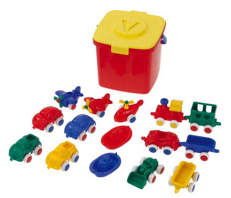 やわらかなボディのカラフルな車、汽車、船、飛行機などの乗り物のおもちゃが、15個入っているセットです。タイヤは、床にやさしい柔らかい素材です。連結遊びもできます。乗り物の長さは約10cmです。おかたずけに便利なバケツ付き。