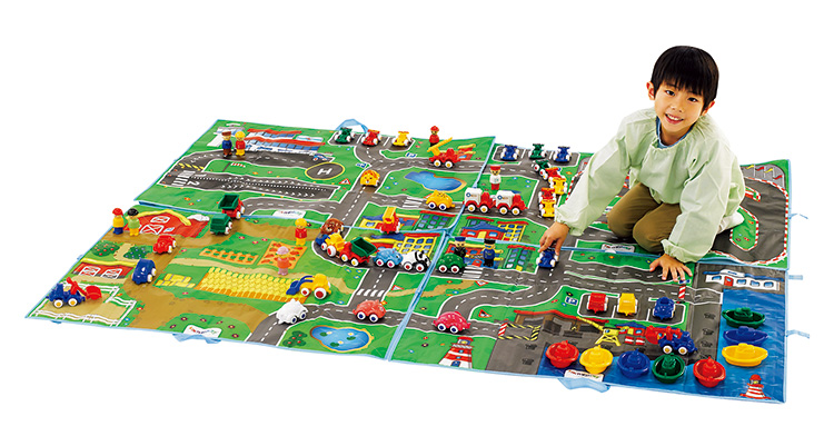 たっぷりの乗り物おもちゃと、プレイマットのセットです。プレイマットの世界観の中で遊びが展開できる乗り物がセットされています。