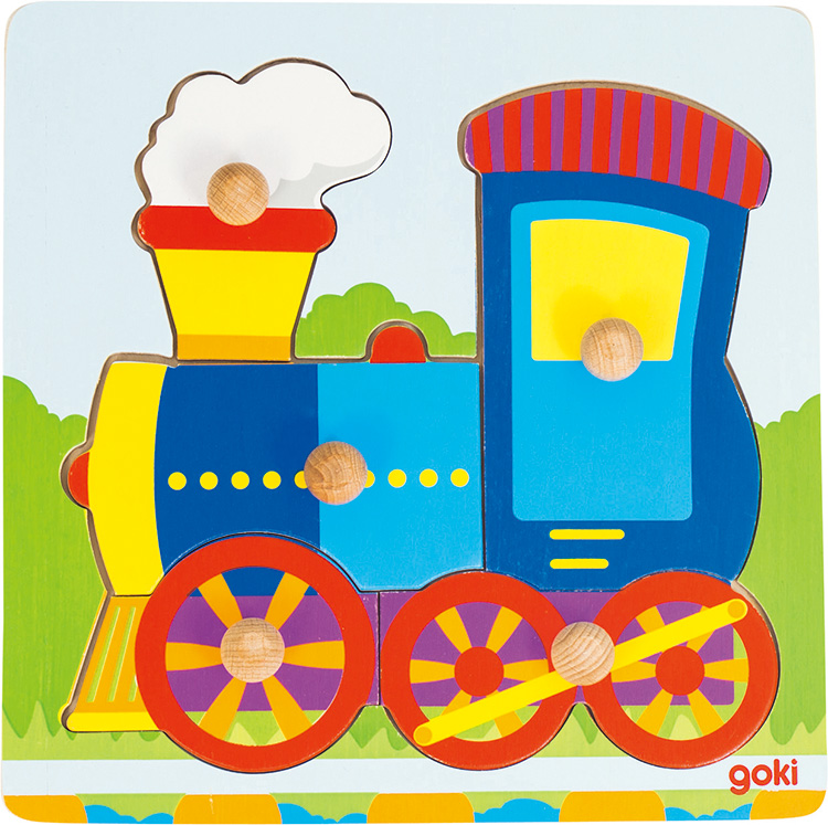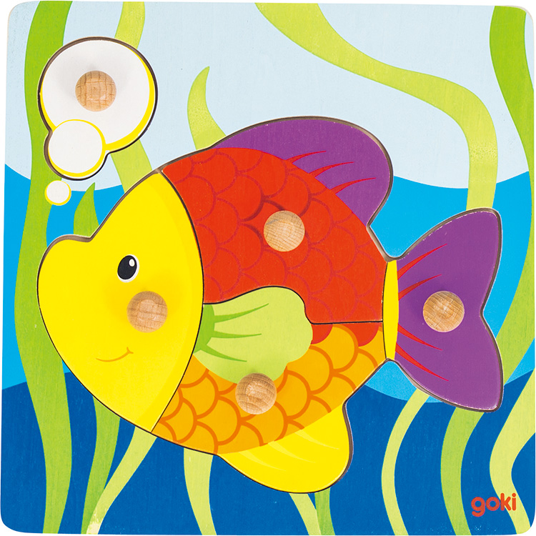 ノブつきでつかみやすく、ひとつのピースが大きなパズルです。それぞれが、5つのピースでさかなやうまなどを構成します。形の違いを見分けるだけでなく、構成する力を身につける効果があります。
