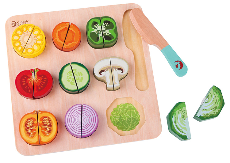 野菜と果物の断面が描かれたパズル。より本物に近いものにふれることで知識が広がります。付属のナイフで野菜をカットしたり、型にはめてパズルにしたりして遊ぶことができます。