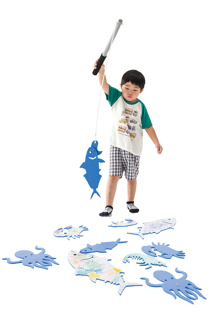 釣り針の磁石で釣り上げて遊びます。過剰に竿を振り回すと魚が落ちてしまうので、微細運動や力を加減する訓練につながります。魚の片面はホワイトボード仕上げとなっており、ホワイトボードマーカーで繰り返し書き込みができます。描画が苦手な子どもも輪郭に沿って描くことができ、達成感を得ることができます。