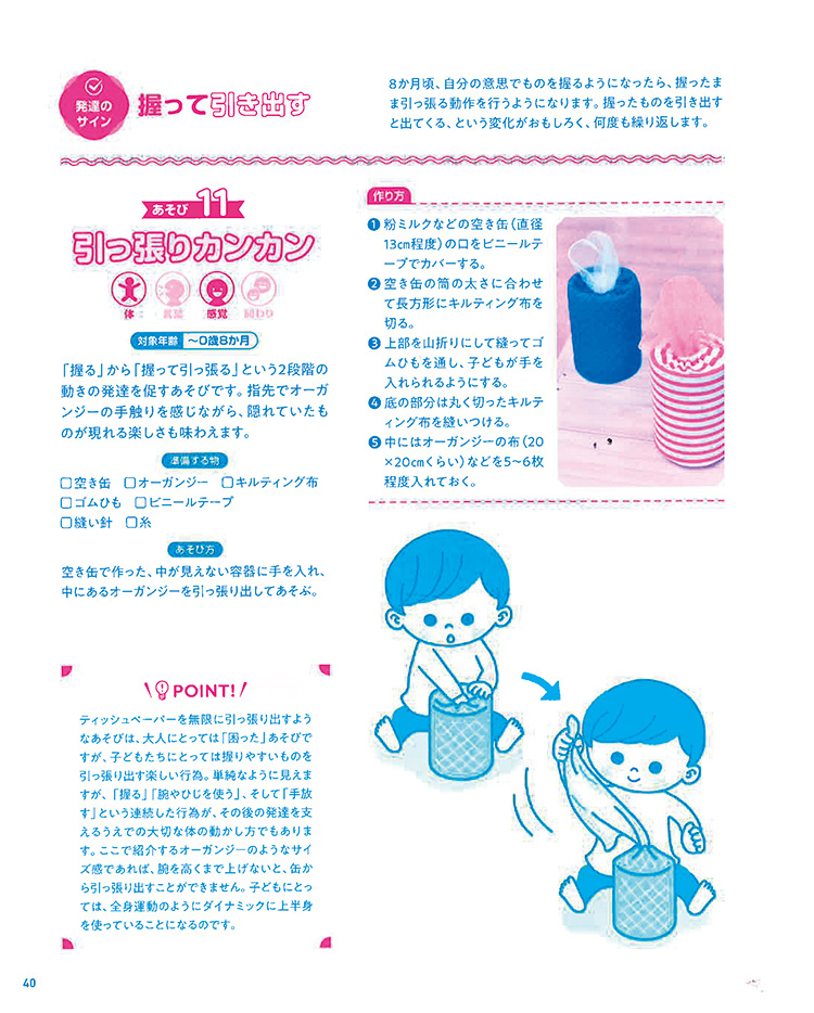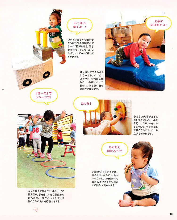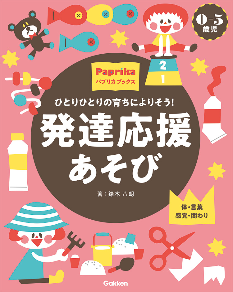 発達を促すアプローチとして、【体(身体機能)】【言葉(認知)】【感覚(感覚統合)】【関わり(情緒や社会性を促すもの)】の4つの観点を中心にしたあそびアイディアを112案掲載。0~2歳児、3~5歳児に分けて詳しく解説しています。