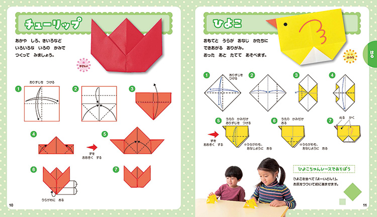 おりがみの折り方は、子どもが読めるように「ひらがな」で表示。子どもが自分で選んで主体的にあそべます。「かんたん」「ふつう」「ちゃれんじ」と難度も表示。大人気の乗り物おりがみも11案紹介!