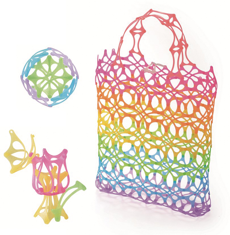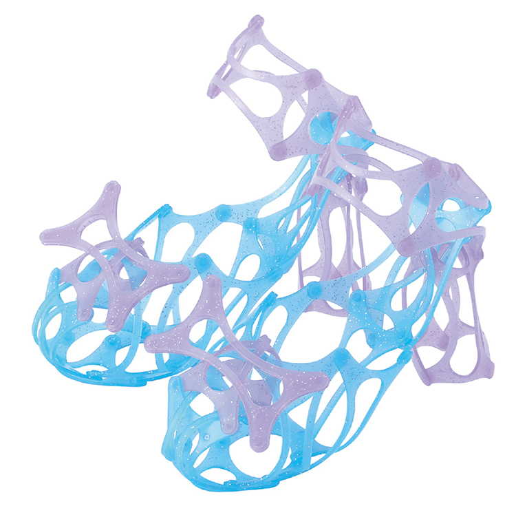 半透明でキラキラしたきれいなラメ入りのワミーです。柔らかいため、曲げたり間を通したりしながら、さまざまなつなぎ方ができます。作ったボールを投げたり、アクセサリーにして身につけたりして、遊びが広がります。