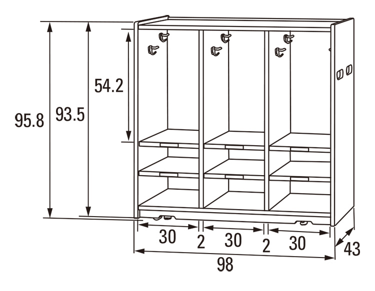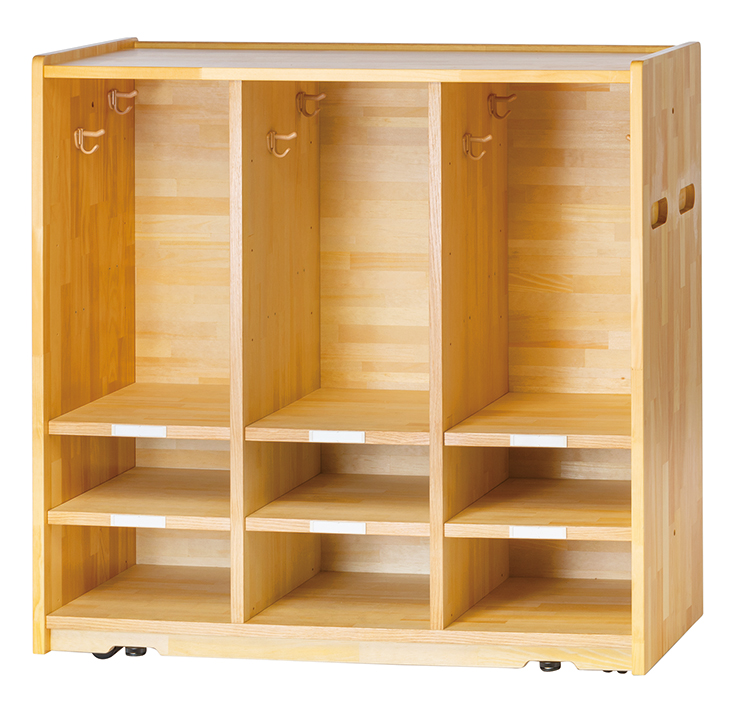 (3段ロッカー下段)棚板位置が下段、フックが上段。