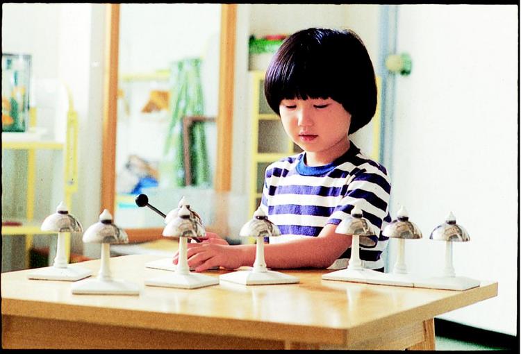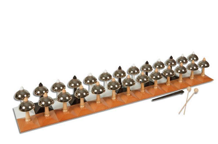 外見は同じベルのセットになっていて、ベルをたたいて同じ音を探し出す(対にする)、音階に並べる(順序付ける)などを行います。