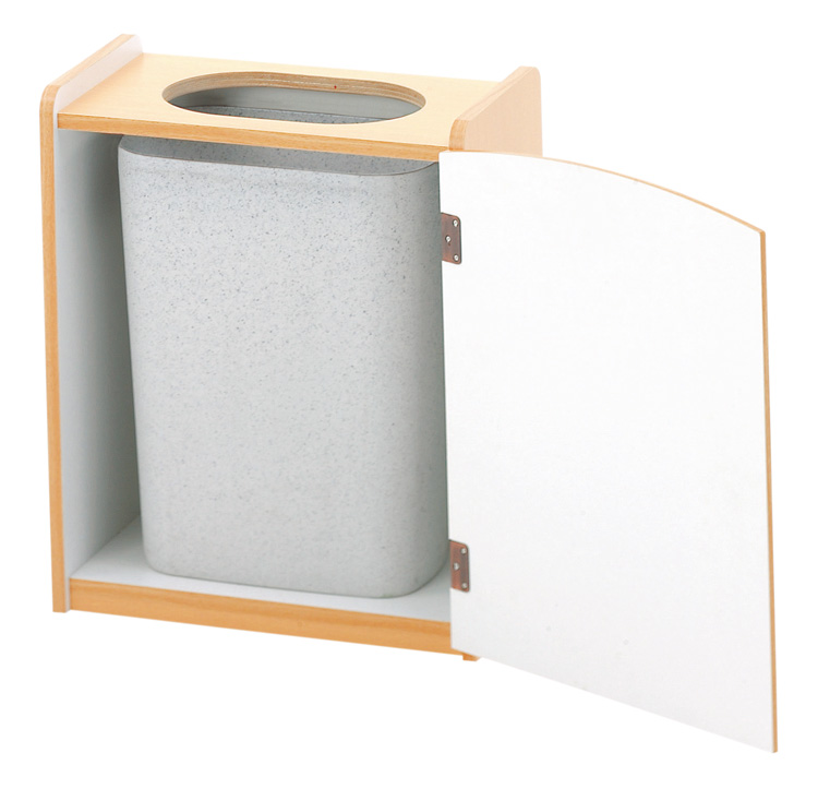 保育室や職員室に合う木目調のダストボックスです。前の扉を開けて、中のケースを出し入れできます。