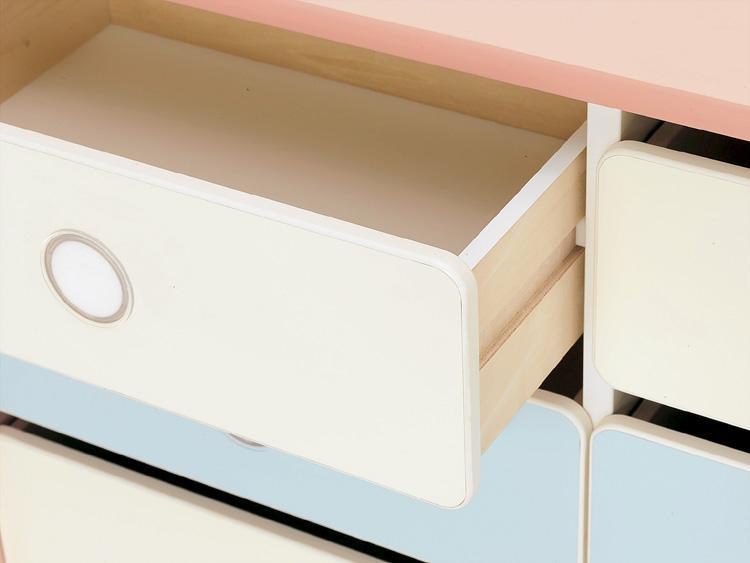 幅の広い引き出しは衣類などをたっぷり収納できます。引き出しのチャイルドロック機能は上部のレバーひとつで操作ができます。引き出しはストッパー付です。