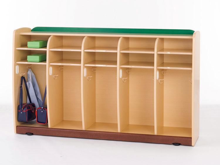 美しい木目柄にグリーンのラインが映えるちょっとシックな保育備品シリーズです。木口材に柔らかいソフトエッジを採用、丸みのあるデザインで安全に配慮しています。足元は丈夫な無垢材を使用しています。キャスター付で移動もらくに行えます。(2箇所のアジャスターを解除することで移動ができます。)