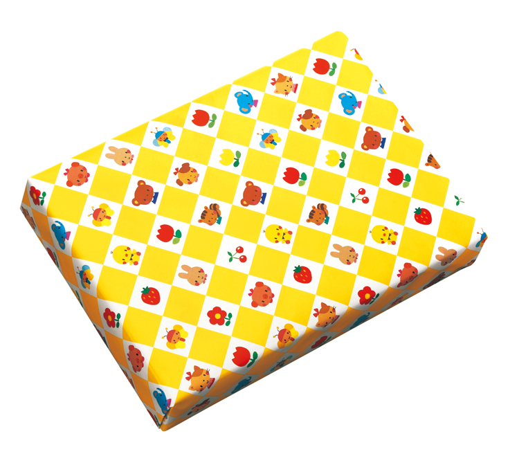 かわいい動物のイラストがいっぱいのカラフルな包装紙です。